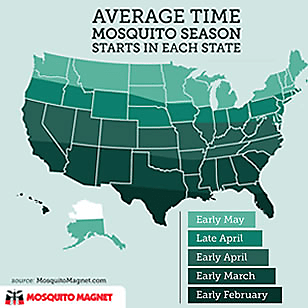 Be sure to start running your mosquito trap before mosquitoes start propagating. Perhaps you’re wondering “when does mosquito season start?” Once the temperature reaches 50°F consistently, mosquito eggs that remained dormant during the winter will begin hatching. Female mosquitoes that have spent the summer in protected areas like basements and trees are now ready to come out and lay their eggs. Make sure that you’re ready!
